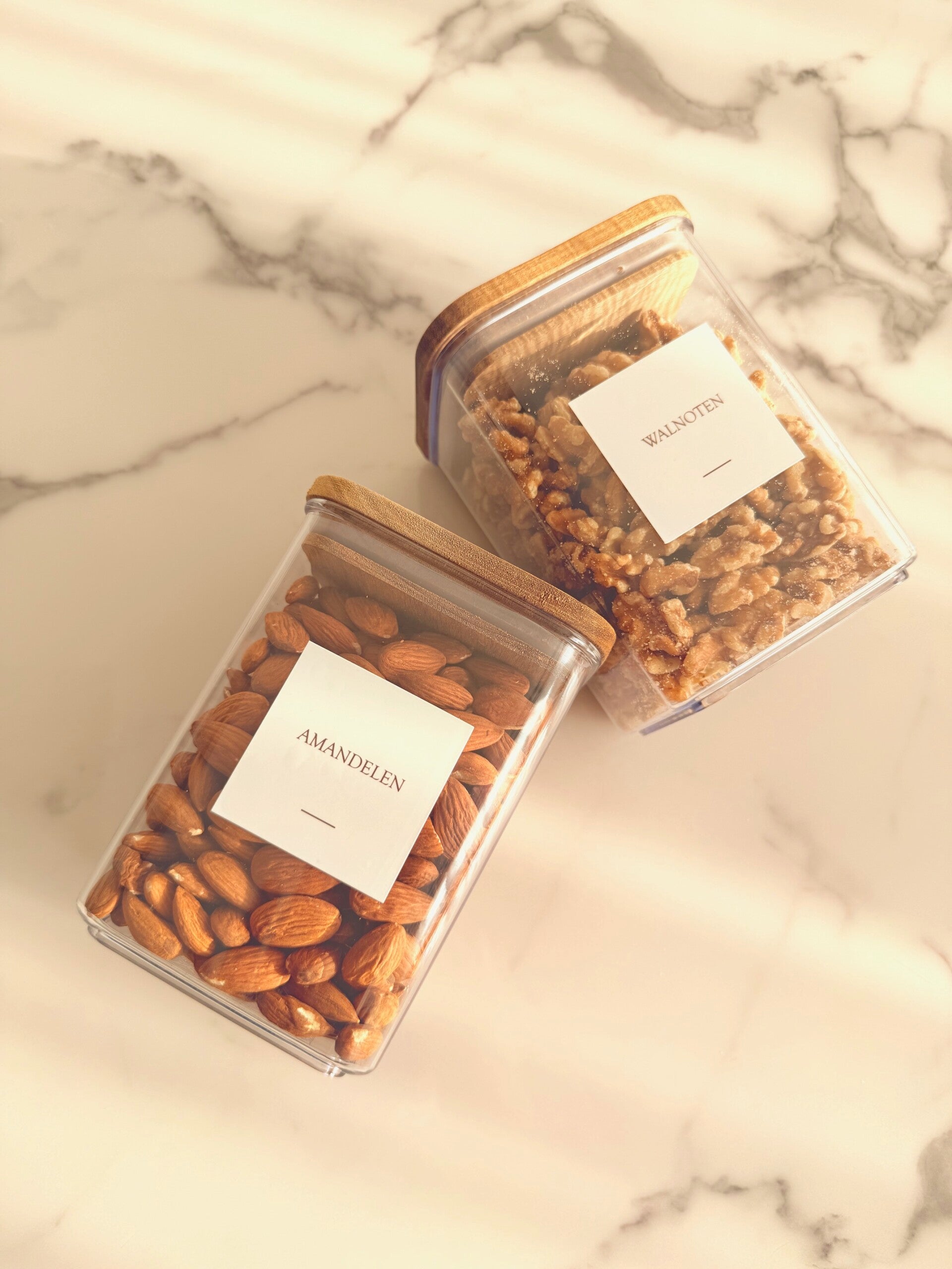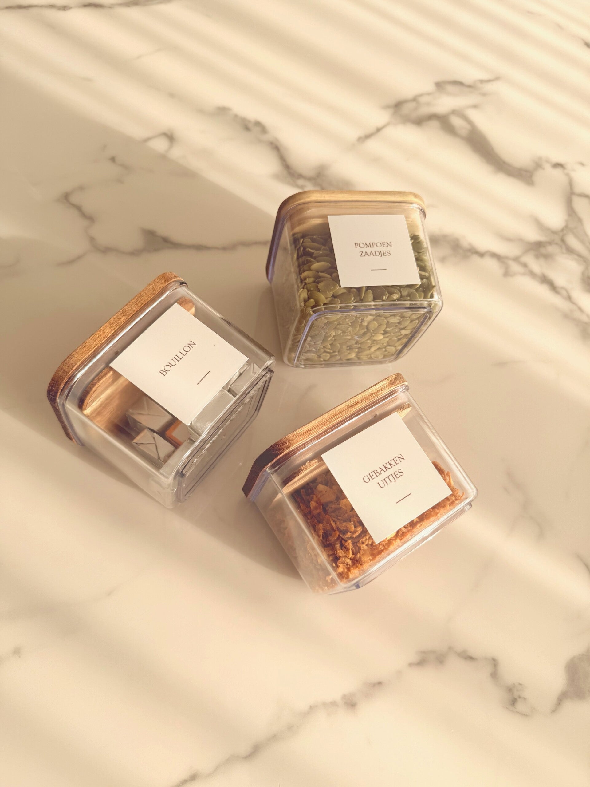 Deze labels voor kruiden en voorraadpotten helpen je keuken overzichtelijk en netjes te houden, met een tijdloze uitstraling.